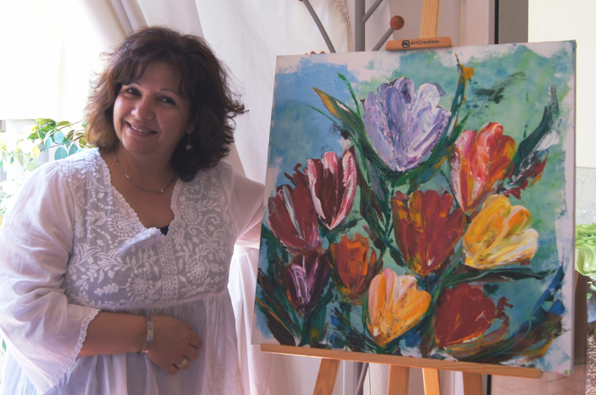 Graça Esteves, nasceu em Lisboa em 1963, é licenciada em Línguas e Literaturas Modernas pela Universidade de Coimbra. Vive há 33 anos em Fátima e leciona Inglês no Colégio. O mundo que Graça Esteves imagina, procura ou recorda tem alegria, harmonia e dinamismo. É através da pintura, com as muitas cores e as diversas texturas, que pretende criar o seu espaço e a sua dimensão, na procura do invisível através do visível, uma espécie de mistura de sonho e vida. Trabalha sobretudo com acrílicos sobre suportes rijos, deixando as cores percorrer a tela e encontrar a sua própria textura, tentando captar a luminosidade que o momento contém.