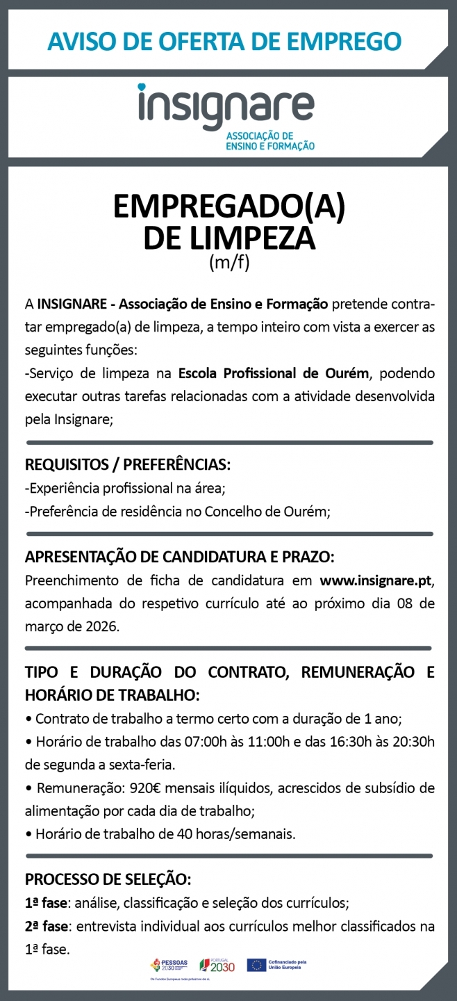 A INSIGNARE-Associação de Ensino e Formação pretende contratar Empregado(a) de Limpeza (m/f).